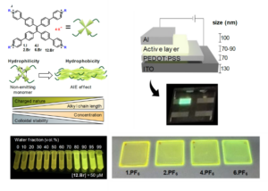 Great collaboration with Eduardo Anaya-Plaza and Mauri Kostiainen!  This is our second paper together. Now we designed ionic emitters with aggregation induced emission (AIE) mechanism that feature i) an easy ion polarizability to assist charge injection and ii) a reversible electrochemical behavior. The hydrophilic yet repulsive effect of pyridiniumbased cationic moieties is balanced with hydrophobic variables (long alkyl chains or counterion chemistry), leading to i) a control between monomeric/aggregate state ruling photoluminescence, ii) redox behavior, and iii) enhanced ion conductivity in thin films. This resulted in light-emitting electrochemical cells, reaching values of 0.19 lm/W at ca. 50 cd/m2. Overall, this design rule will be key to advance ionic active species for optoelectronics.